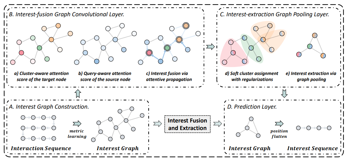 我们提出了cluster- and query-aware graph attentive convolutional layer可以收到用户的核心兴趣。位于cluster中心的item。